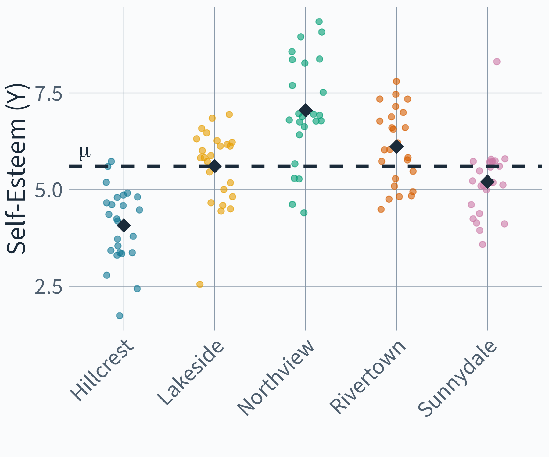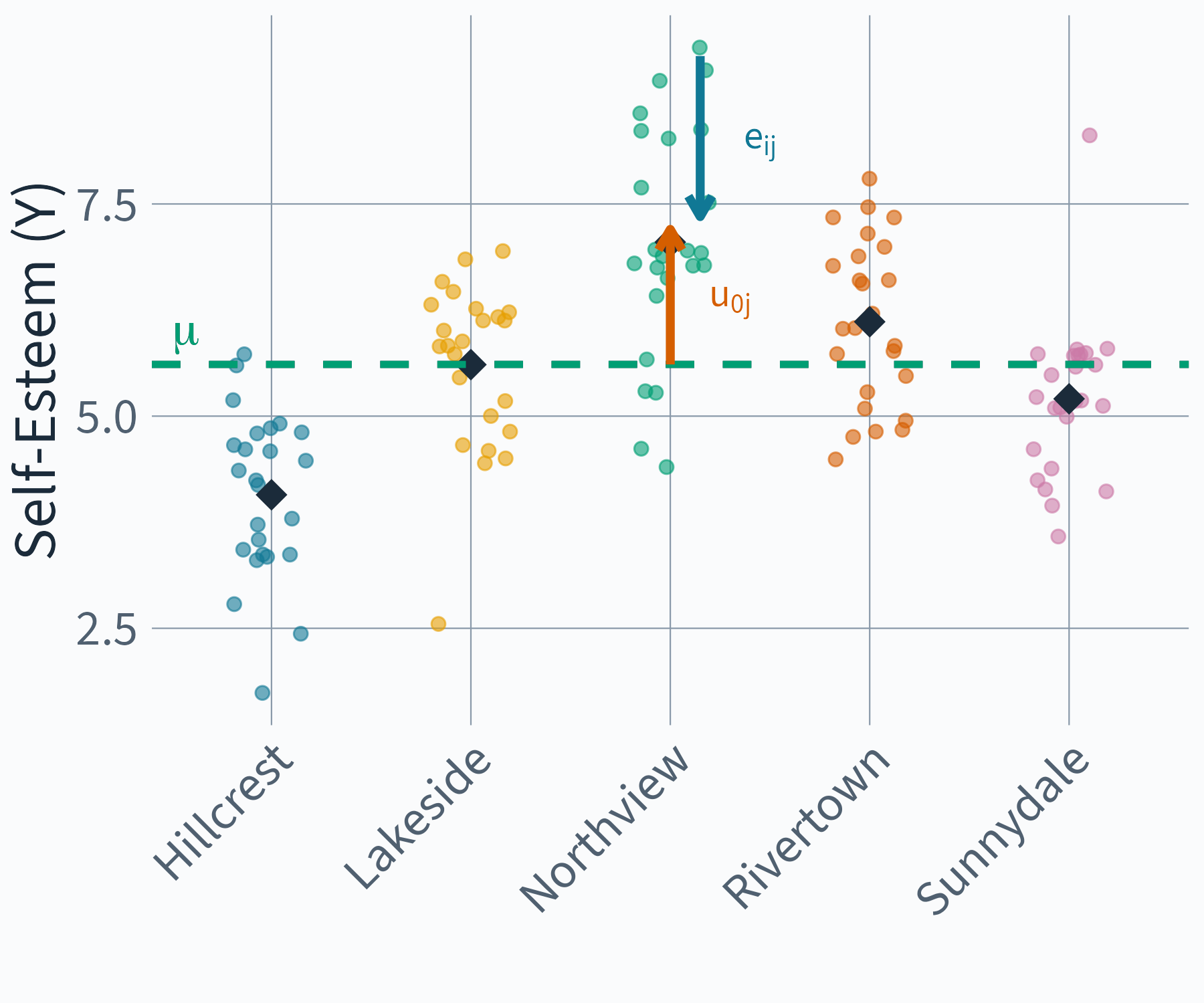 y_{ij} = \color{#009E73}{\mu}\color{black} + \color{#D55E00}{u_{0j}}\color{black} + \color{#107895}{e_{ij}}\color{black}